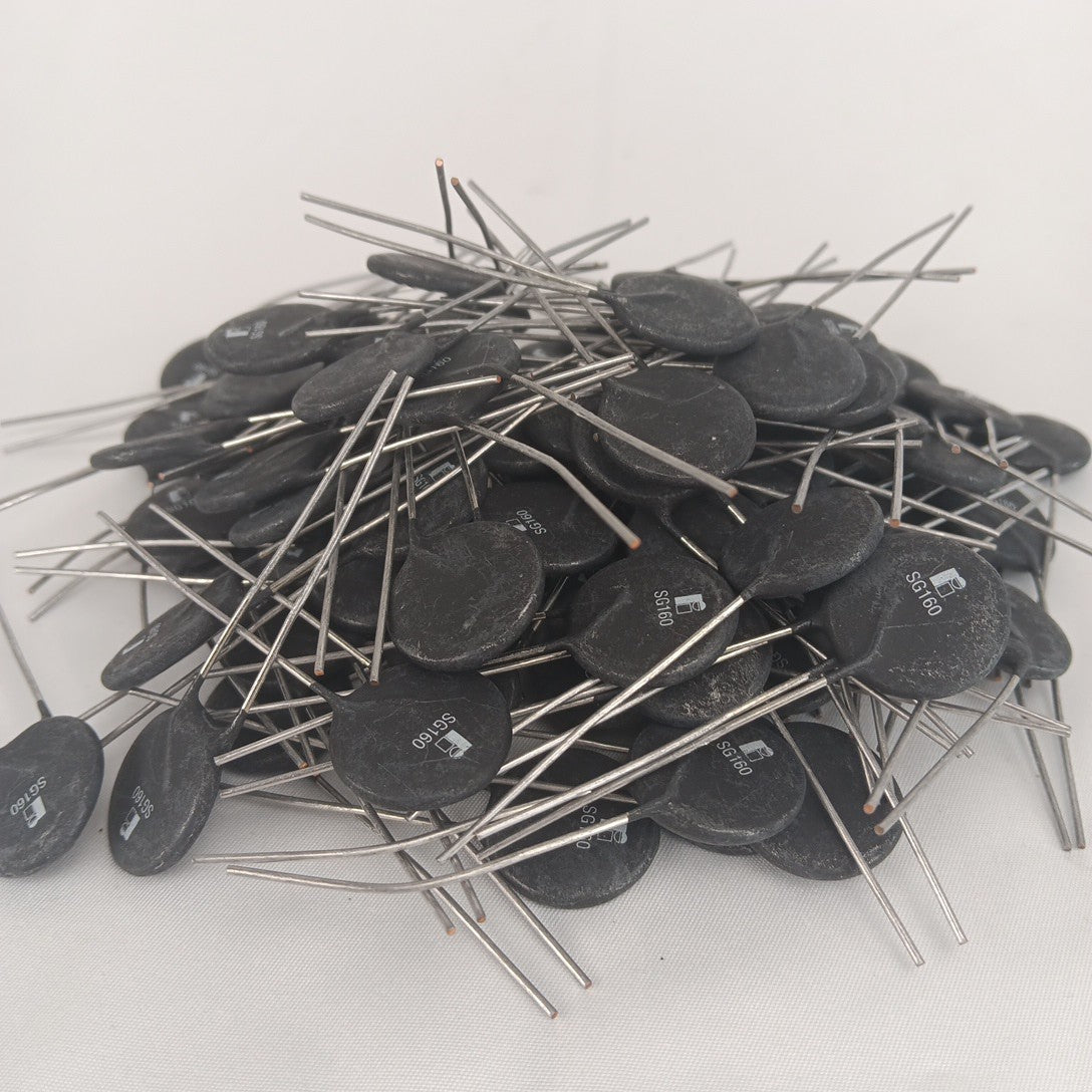 Lot of 100 brand new SG160 NTC thermistors. These 16Ω thermistors are ideal for suppressing inrush current in power supply circuits, amplifiers, and other AC electronics.